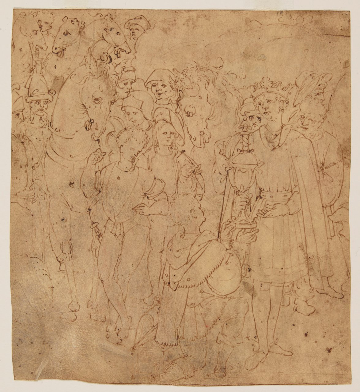 Più incerta l’interpretazione dell’immagine sul recto, in cui la critica propende per riconoscere una scena di Presentazione del calice, un dettaglio da interpretare nel più ampio contesto di una possibile Adorazione dei Magi. Non si è riusciti finora a individuare uno specifico antecedente pittorico conservato fino a noi. Sembra tuttavia assodato che, verso la fine del primo decennio del Cinquecento, modelli grafici derivati da Pisanello (a loro volta desunti da modelli pittorici) costituissero occasioni di esercizio e fonti di ispirazione per Amico Aspertini. Da una di queste composizioni e invenzioni circolanti in ambito pisanelliano derivò forse anche il disegno esposto in mostra.