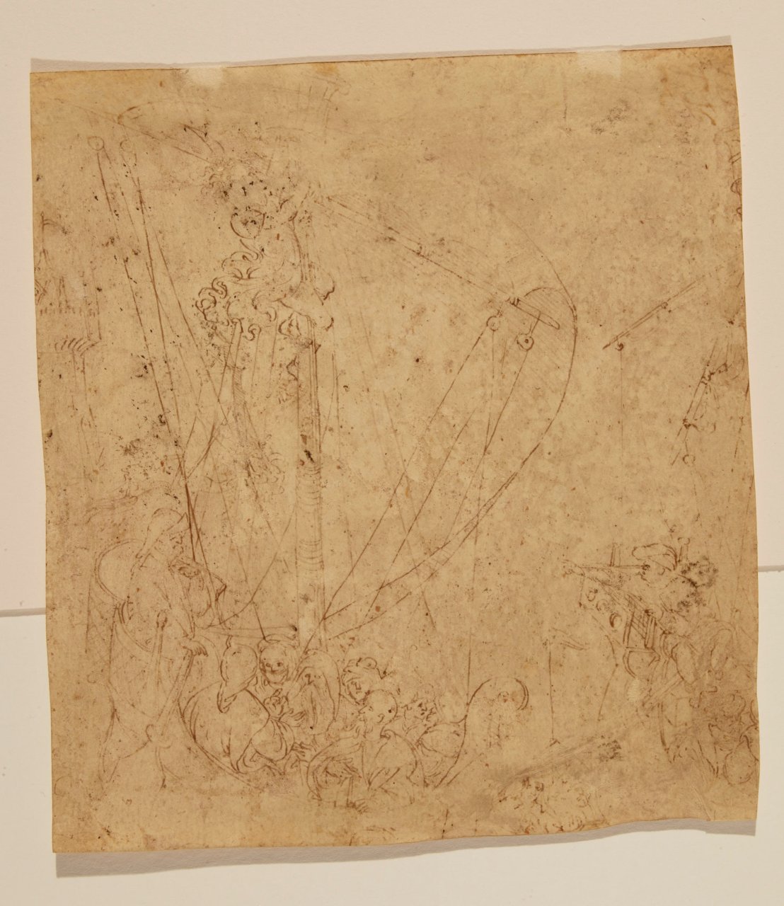 Questo straordinario manufatto, insieme ad altri tre fogli membranacei conservati sempre al Gabinetto dei Disegni, faceva parte con ogni probabilità di un libretto d’appunti ora smembrato, forse uno dei tanti con cui l’artista girava per il Nord Italia, schizzando tutto quello che colpiva la sua fantasia. A un certo punto del lungo percorso collezionistico i quattro fogli disegnati da Amico Aspertini entrarono a far parte di un vasto e composito corpus grafico raccolto presso la fabbriceria del santuario milanese di Santa Maria dei Miracoli presso San Celso, prima di essere acquistati nel 1924 dal Comune di Milano.