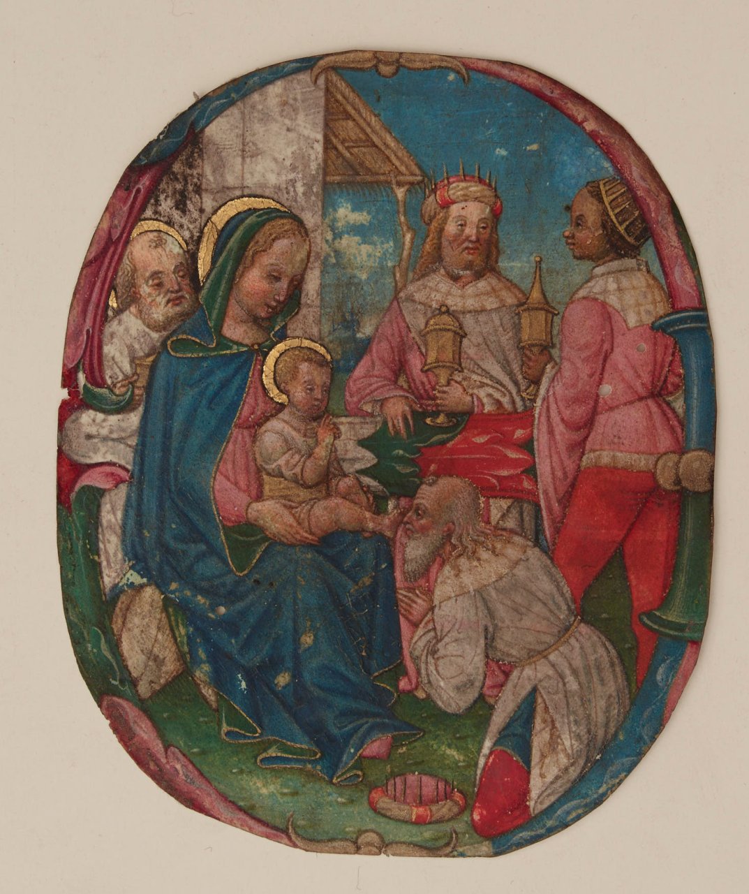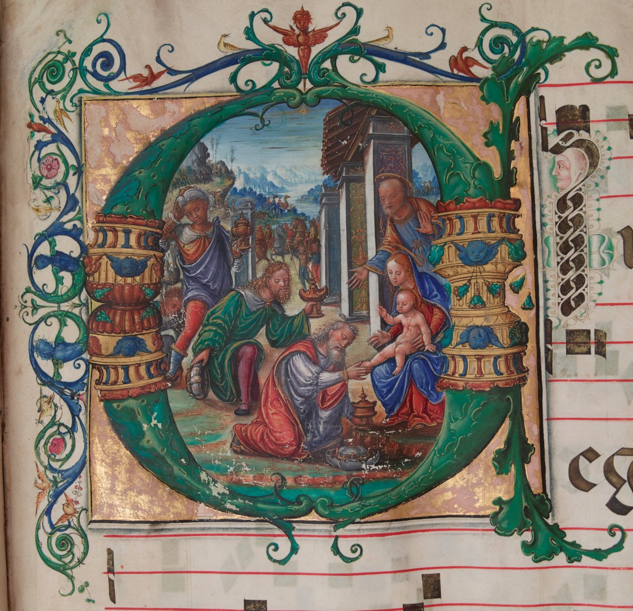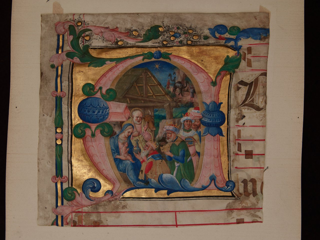 Accanto al corale, due iniziali della fine del XV secolo ritagliate secoli fa da manoscritti liturgici smembrati attestano la persistenza del tema iconografico dell’Adorazione dei Magi nei prodotti librari di uso ecclesiastico. Entrambi i cutting fanno parte di un consistente ma eterogeneo fondo di materiali membranacei e cartacei, con provenienza dai Civici Musei d’Arte del Comune di Milano, entrati a far parte delle raccolte della Biblioteca Trivulziana nel 1961. Il primo ritaglio, da ricondursi probabilmente all’area lombardo-veneta verso l’ultimo quarto del XV secolo, presenta la scena evangelica inquadrata entro il profilo dell’iniziale istoriata A, su fondo con foglia d’oro applicata. Il secondo ritaglio, dove il topos iconografico abita l’iniziale E, è stato recentemente attribuito al Maestro dei Graduali di San Salvatore a Pavia [1], un anonimo miniatore attivo nel contesto pavese e lombardo tra la fine del Quattrocento e i primi anni del Cinquecento. Caratterizzano il suo stile la monumentalità dei personaggi, l’accesa tavolozza cromatica e l’attenzione ormai pittorica alla resa dei paesaggi e delle architetture.