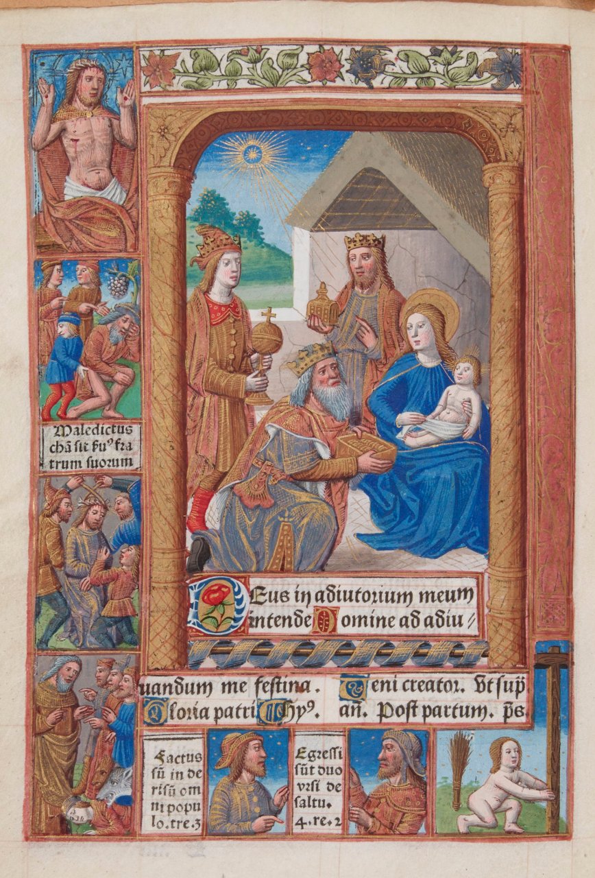 Si tratta di tre libri d’ore, volumi preposti ad accompagnare la devozione privata dei laici durante le cosiddette ‘ore canoniche’ del giorno. Nei libri d’ore rinascimentali il nucleo centrale era costituito di norma dall’officio della Vergine, le Horae Beatae Mariae Virginis, spesso accompagnate da illustrazioni che ripercorrevano gli episodi più significativi della vita di Maria, tra cui anche l’Adorazione dei Magi. Nei manoscritti coevi l’apparato decorativo, volto a offrire spunti di meditazione individuale, era miniato a mano. Negli esemplari a stampa, invece, figure e immagini erano replicate grazie alla tecnica dell’incisione a rilievo (di norma la xilografia).