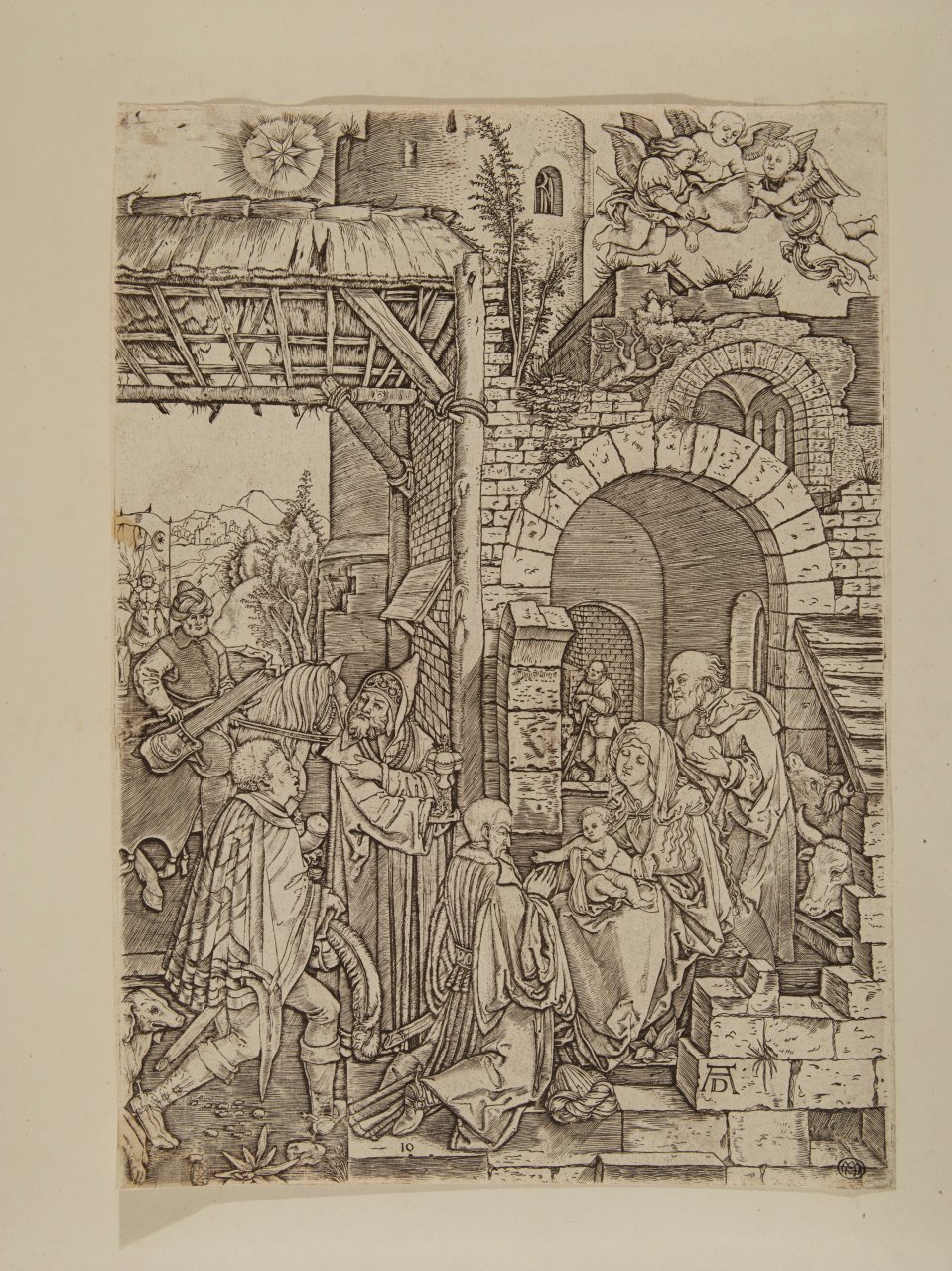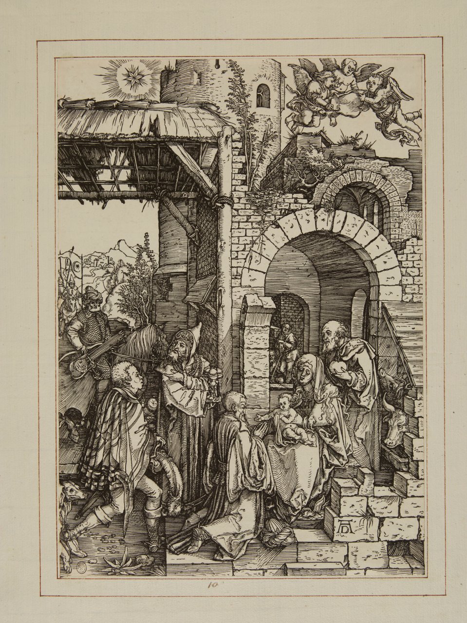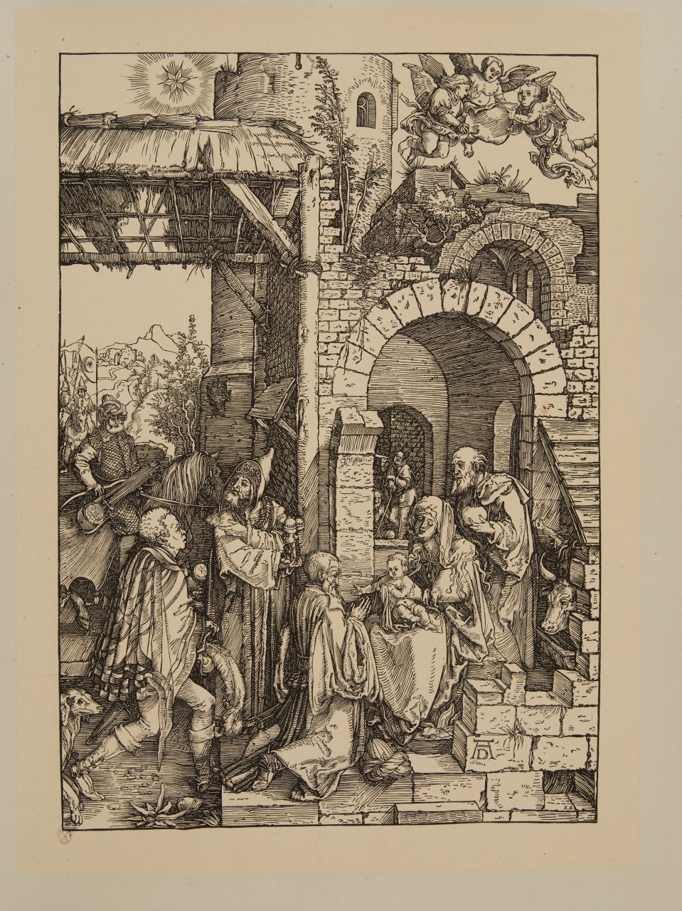 Albrecht Dürer (Nuremberg, 1471-1528), a key exponent of German Renaissance painting, in the spring of 1495 opened an artist’s studio in his hometown, where he chiefly worked as an engraver, practising both wood engraving and copperplate. In this period Dürer created some series of engravings that are among the most important of his entire production. Not long after 1500, the artist began to work on an important new project - a series of woodcuts of the Life of the Virgin. By 1505, almost all the prints were finished (including the Adoration of the Magi here on display), while the whole series was completed between 1510 and 1511, after his second visit to Venice. In 1511, complete with title page, the work was published as a book: Epitome in divae parthenices Mariae historiam, Nuremberg 1511. The same iconographic theme – though the scene is composed very differently – was revisited by the artist in a famous oil-on-wood painting of 1504, now conserved in the Galleria degli Uffizi in Florence. And in 1511, Dürer was to make a final version of the Adoration of the Magi, again using the woodcut technique.