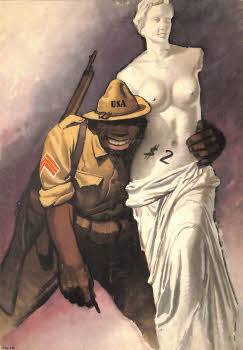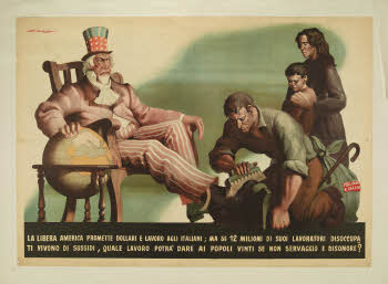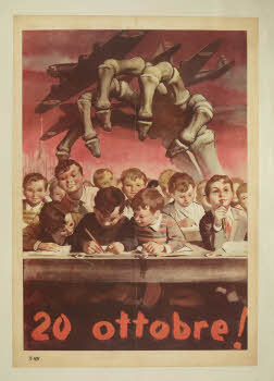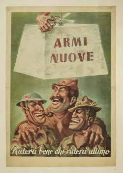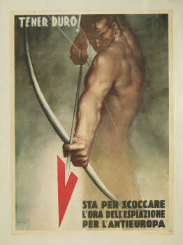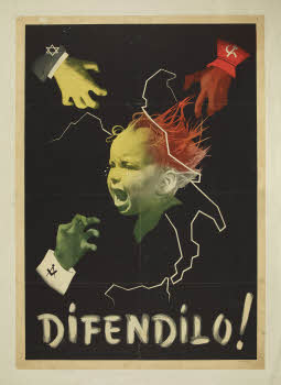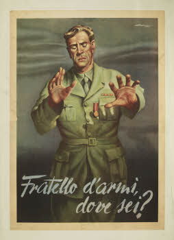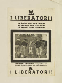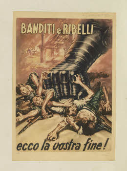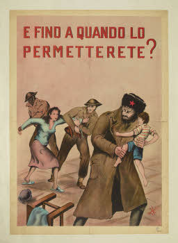 La propaganda della RSI aveva lo scopo principale di chiamare all’appello una popolazione oramai provata e disillusa, raccogliendola attorno ad antichi miti e nuovi valori. Per tutti i 600 giorni di Salo’ la ricerca del consenso fu spasmodica. Dall’altra parte, le forze della resistenza orientarono la comunicazione politica contro il fascismo e il nazismo, evocando una nuova Italia libera e democratica; anche le forze alleate parteciparono a questa guerra di propaganda utilizzando lo strumento della satira su Mussolini e Hitler. La propaganda della resistenza appare più “povera”, dati gli scarsi mezzi a disposizione dei patrioti che combattevano in clandestinità il fascismo, mentre la RSI impiegò ogni mezzo economico possibile per mobilitare a suo favore gli italiani, contando sulla collaborazione creativa e grafica di artisti dalla straordinaria vena creativa, come Gino Boccasile e Dante Coscia. In occasione della mostra documentaria “1943-1944. Immagini e Propaganda nella Repubblica Sociale Italiana”, allestita presso Palazzo Moriggia|Museo del Risorgimento dal 19 ottobre al 19 novembre 2023, si propone una selezione delle opere grafiche realizzate in quel periodo e facenti parte delle collezioni delle Civiche Raccolte Storiche. Manifesti, piccole locandine, fogli volanti, testimoniano la ricchezza ideativa delle più note firme della cartellonistica del tempo, talvolta però ricorrendo anche ad immagini grevi e volgari dedicate agli alleati. Gli “invasori” erano rappresentati come gangster, che con i bombardamenti stavano distruggendo le città e la civiltà italiana, come stupratori o profanatori della religione. Su tutto dominava un convinto razzismo: i soldati afroamericani venivano descritti come criminali selvaggi, gli inglesi erano decadenti colonialisti, i russi diventavano orribili orchi rapitori di bambini. La RSI fu una repubblica convintamente antisemita: gli ebrei – presentati come laidi profittatori dal naso adunco e le fattezze grossolane – erano considerati come i veri manovratori del nemico. Quanto ai partigiani, questi venivano considerati semplicemente banditi e ribelli e sovente dileggiati.